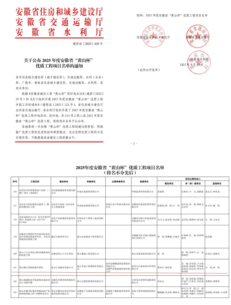 近日,安徽省住房和城鄉(xiāng)建設(shè)廳、安徽省交通運(yùn)輸廳、安徽省水利廳聯(lián)合公布了2025年度省“黃山杯”優(yōu)質(zhì)工程項(xiàng)目名單,黃山市建工集團(tuán)承建的黃山橫江灣凱悅嘉軒酒店項(xiàng)目成功入選,榮膺安徽省建設(shè)工程質(zhì)量最高榮譽(yù)——“黃山杯”獎(jiǎng)。
